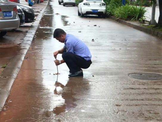 ▲公司管理人員能動性強協(xié)助環(huán)衛(wèi)工人清理堵塞下水道