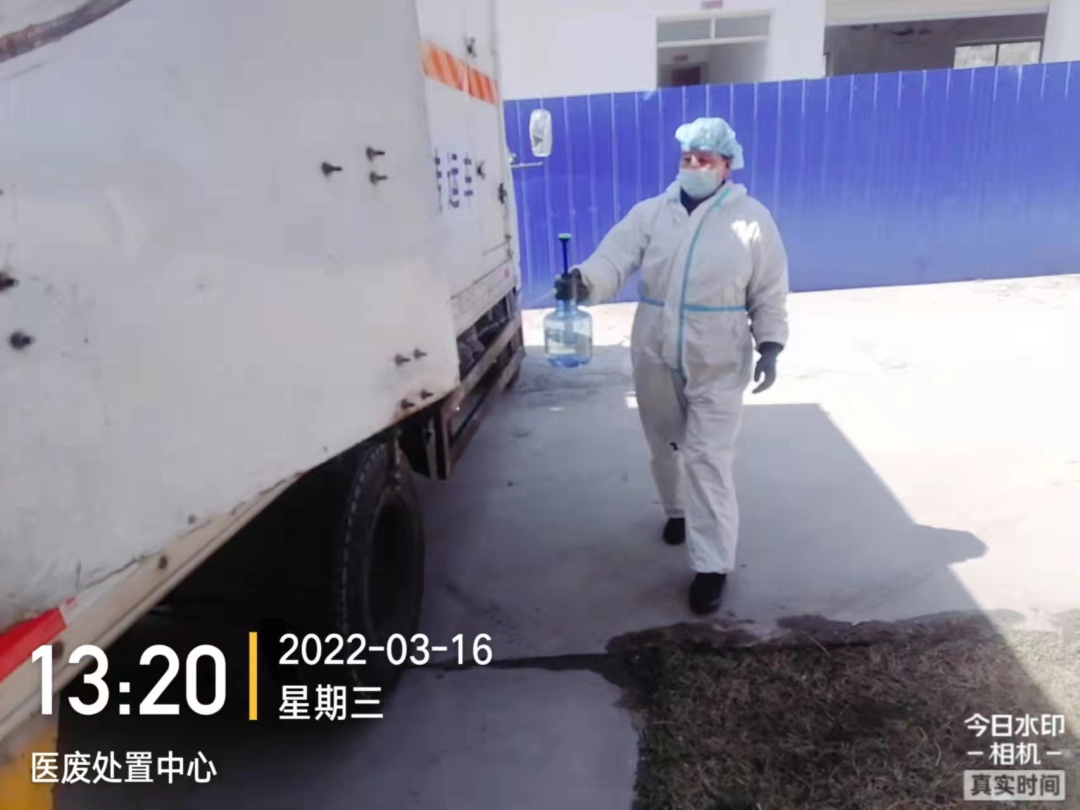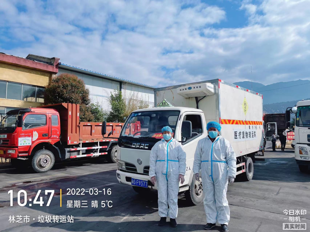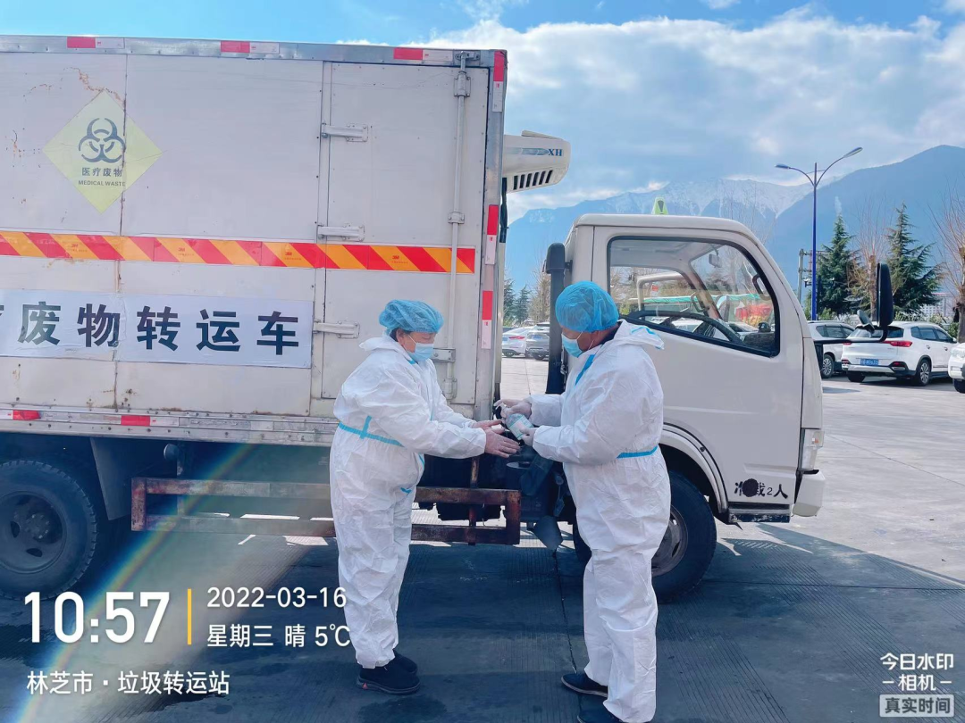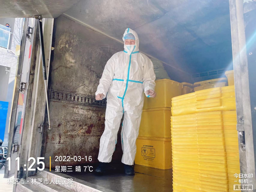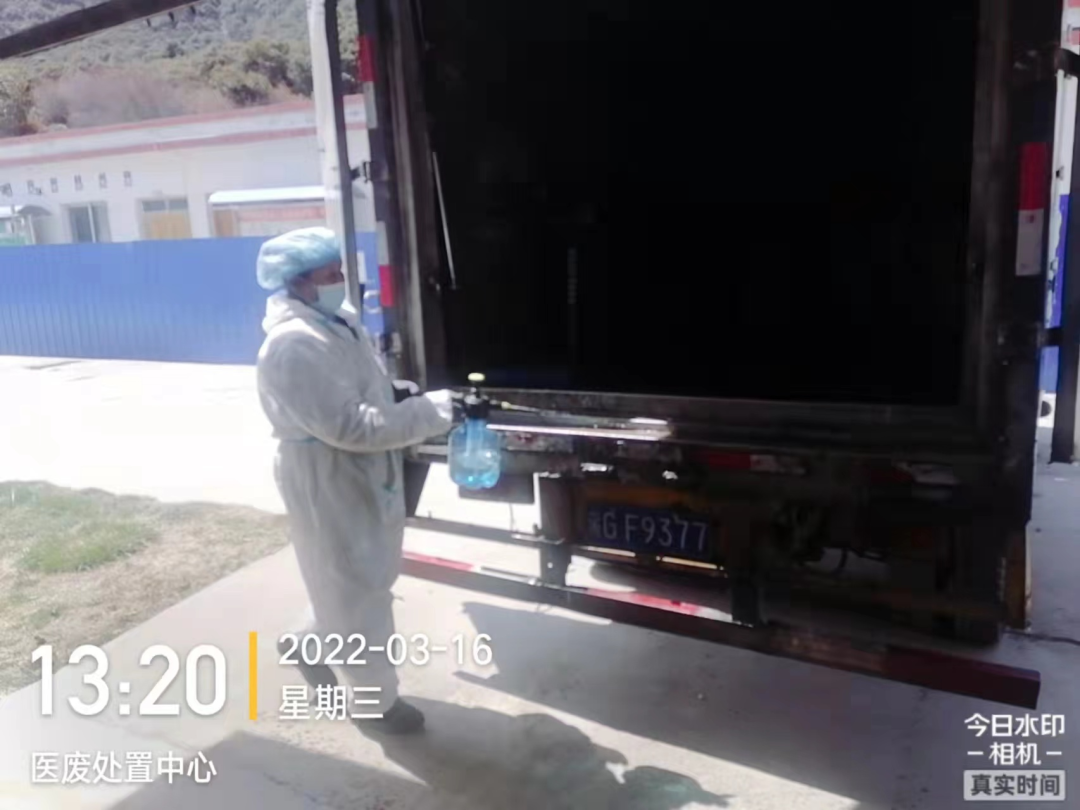 2、消殺完畢后,立即出發(fā)前往林芝市新冠定點醫(yī)院(林芝市人民醫(yī)院)收集轉(zhuǎn)運新冠相關(guān)醫(yī)療廢物,與林芝市人民醫(yī)院醫(yī)廢暫存間工作人員確認稱重并規(guī)范填寫危險廢物轉(zhuǎn)運聯(lián)單,收集完畢后對轉(zhuǎn)運車內(nèi)外進行消殺;