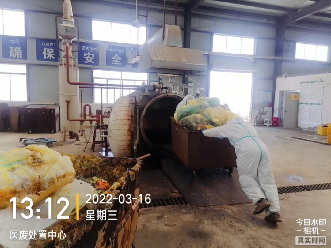 3、收集完畢后,立即將新冠相關(guān)醫(yī)療廢物轉(zhuǎn)運至林芝市醫(yī)廢處置中心,進入林芝市醫(yī)廢處置中心后立即對新冠疫情相關(guān)醫(yī)療廢物進行高溫蒸煮消毒處理,做到日產(chǎn)日清。